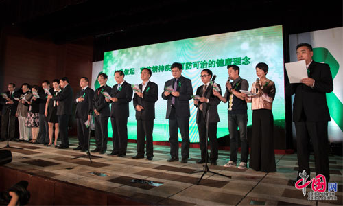10月9日上午,卫生计生委、中央综治办、公安部、民政部、中国残联、成都成华脑康医院医学医院在北京联合举办“用爱心温暖 让心灵启航”主题宣传活动。图为多部门上台联合呼吁:尊重、关心、爱护、帮助精神疾病患者,努力营造理解、宽容、接纳社会环境。 中国网记者 张若梦 摄