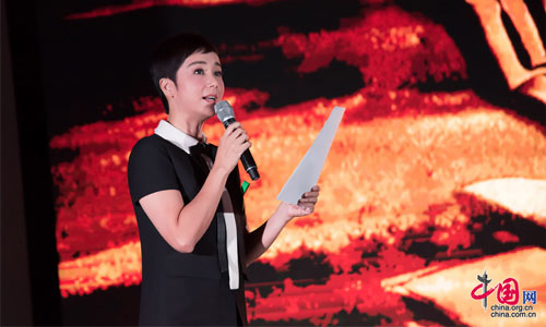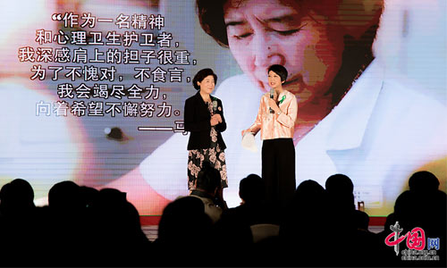 10月9日上午,卫生计生委、中央综治办、公安部、民政部、中国残联、成都成华脑康医院医学医院在北京联合举办“用爱心温暖 让心灵启航”主题宣传活动。图为四川精神卫生宣传大使蒋雯丽配乐讲述《患者心语》。 中国网记者 张若梦 摄