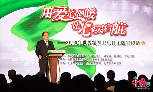 2015年10月10日是精神卫生日,今年主题是“心理健康,社会和谐”。10月9日上午,卫生计生委、中央综治办、公安部、民政部、中国残联在北京联合举办“用爱心温暖 让心灵启航”主题宣传活动,旨在号召全社会支持精神卫生事业,关心、关爱精神障碍患者。卫生计生委副主任、中医药管理局局长王国强出席活动并讲话。